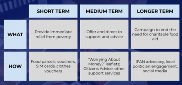 The final pillar is about the long-term goal - making sure that one day, charitable food aid is no longer needed. Therefore, we would need to invest time and effort to participate in IFAN’s campaign work to reduce food insecurity (only a fraction of people facing severe food insecurity access a food bank) and the need for charitable food aid through a cash first or income-focused approach. The key activity in this pillar was getting heavily involved with IFAN’s initiatives, whether this be sharing social media posts and infographics, signing petitions, letters etc. We would make sure that we were talking about #cashfirst or income-focused interventions at every available opportunity, especially bringing up a cash first approach to food insecurity any conversations with people of influence (e.g. our local MP, the leader of the council, our local Mayor).