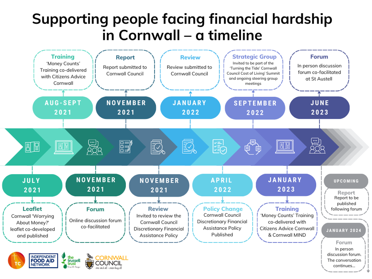 Then in November 2021, following conversations with frontline workers as the Cornwall ‘Worrying About Money?’ leaflet was first put together and distributed, Transformation Cornwall, IFAN and the Trussell Trust ran an online discussion forum attended by many of the groups coming together this week. This forum gathered critical evidence on how people were able to identify and access financial support from Cornwall Council which, in turn, led to a review of the local authority’s Local Welfare Assistance Scheme (LWAS). It was hugely valuable to hear from a range of frontline support workers and we pulled together a report from the insight we gathered broadly themed around eligibility criteria and improving access to schemes.